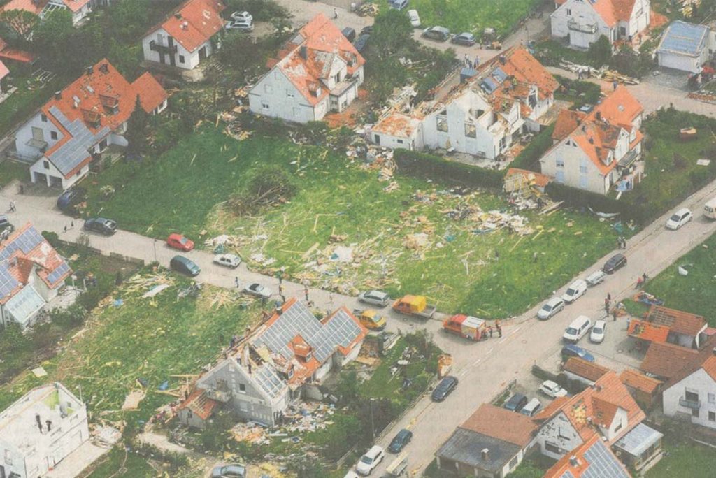 Roofs have substantial damage but modules appear for the most part undamaged.