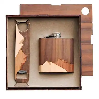 The Mountain Bespoke Bar Box Set contains a 6 oz flask and a bottle opener. The durable flask features a unique mountain design and is great for traveling or to give as a gift. Both wooden flask and bottle opener are handmade in the USA from stainless steel and sustainably harvested wood.