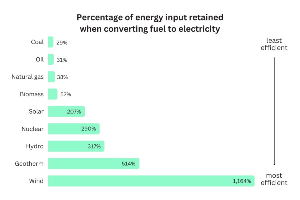 Notice from the graph that wind knocks energy efficiency out of the park (1,164%)! Geothermal is better than hydro at 514%.