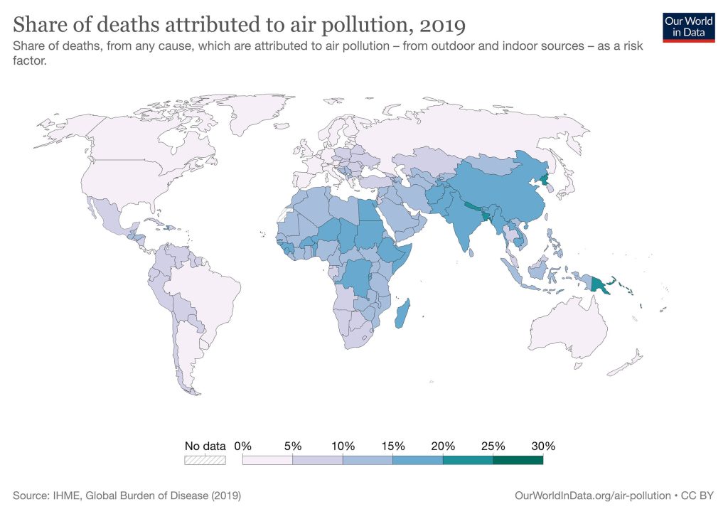 According to Our World in Data, air pollution contributes to 11.65% of deaths across the globe. This is because air pollution raises the risk of cardiovascular and respiratory disease, diabetes, stroke, and lung cancer.